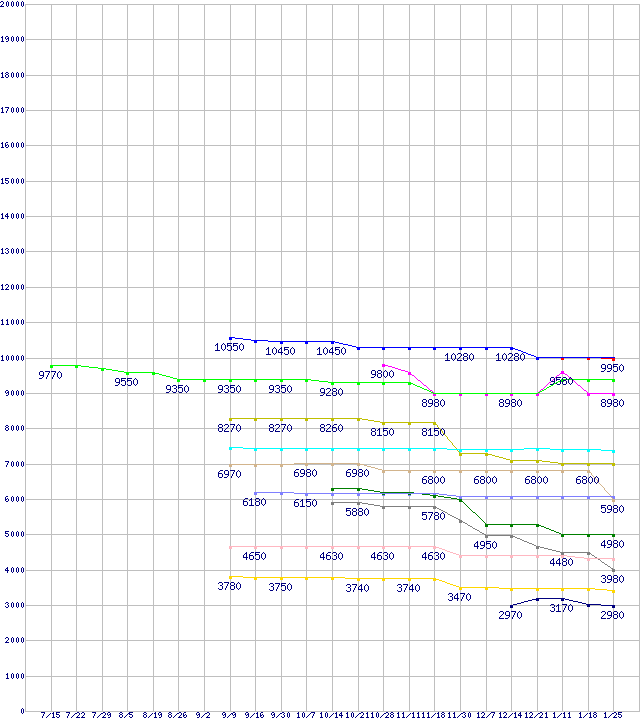 CPU主要製品(最安値1万円未満)の最安値推移↑前グラフ↓次グラフ(2011年7月15日〜2012年1月25日)※このグラフは過去のデータも税率5%相当に調整した税込み相当額のグラフです。凡例Core i3-2120T (2.60GHz,TDP 35W)A6-3670K (2.7GHz,TDP 100W)Core i3-2100 (3.1GHz,TDP 65W)FX-4100 (3.6GHz,L2 4MB,L3 8MB,TDP 95W)Pentium G860 (3.0GHz,TDP 65W)A6-3500 (2.1GHz,TDP 65W)Pentium G630T (2.3GHz,TDP 35W)Athlon II X4 631 (2.6GHz,TDP 100W)A4-3400 (2.7GHz,TDP 65W)Celeron G540 (2.5GHz,2MB,TDP 65W)A4-3300 (2.5GHz,TDP 65W)Celeron G530 (2.4GHz,2MB,TDP 65W)Celeron G460 (1.8GHz,1.5MB,TDP 35W)※製品名をクリックすると個別のグラフを表示します※点線部は販売店が確認できなかった、または調査データがないことを示します