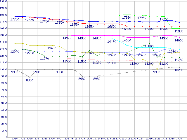 CPU主要製品(最安値1万円〜2万円未満)の最安値推移↑前グラフ↓次グラフ(2011年7月15日〜2012年1月25日)※このグラフは過去のデータも税率5%相当に調整した税込み相当額のグラフです。凡例Core i5-2500K (3.30GHz,TDP 95W)Core i5-2405S (2.50GHz,TDP 65W)FX-8120 (3.1GHz,L2 8MB,L3 8MB,TDP 125W)Core i5-2320 (3.00GHz,TDP 95W)FX-6100 (3.3GHz,L2 6MB,L3 8MB,TDP 95W)Phenom II X4 970 Black Edition (3.5GHz,L2 512KB×4,L3 6MB,TDP 125W)Phenom II X4 910e (2.6GHz,L2 512KB×4,L3 6MB,TDP 65W)A8-3870K (3.0GHz,TDP 100W)A8-3850 (2.9GHz,TDP 100W)Core i3-2125 (3.30GHz,TDP 65W)Phenom II X4 955 (3.2GHz,L2 512KB×4,L3 6MB,TDP 95W)※製品名をクリックすると個別のグラフを表示します※点線部は販売店が確認できなかった、または調査データがないことを示します