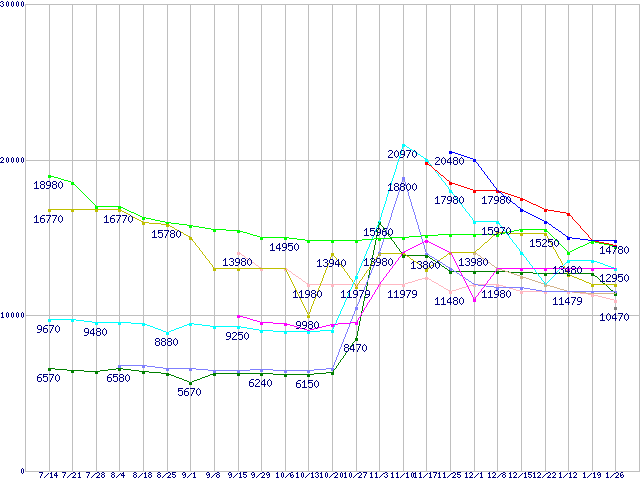 HDD/SSD主要製品(最安値1万円〜1万5千円未満)の最安値推移↑前グラフ↓次グラフ(2011年7月14日〜2012年1月26日)※このグラフは過去のデータも税率5%相当に調整した税込み相当額のグラフです。凡例ST3000DM001 (3TB,64MB)MZ-7PC128 (128GB,MLC)m4 (128GB,MLC)WD10JPVT (1TB,8MB)WD30EZRX (3TB,64MB)その他6Gbps対応SSD (128GB,MLC)WD25EZRX (2.5TB,64MB)ST2000DM001 (2TB,64MB)0S03224(純正パッケージ品) (2TB,32MB)その他SandForce製コントローラ搭載SSD(6Gbps) (120GB,MLC)WD10EZRX (1TB,64MB)※製品名をクリックすると個別のグラフを表示します※点線部は販売店が確認できなかった、または調査データがないことを示します
