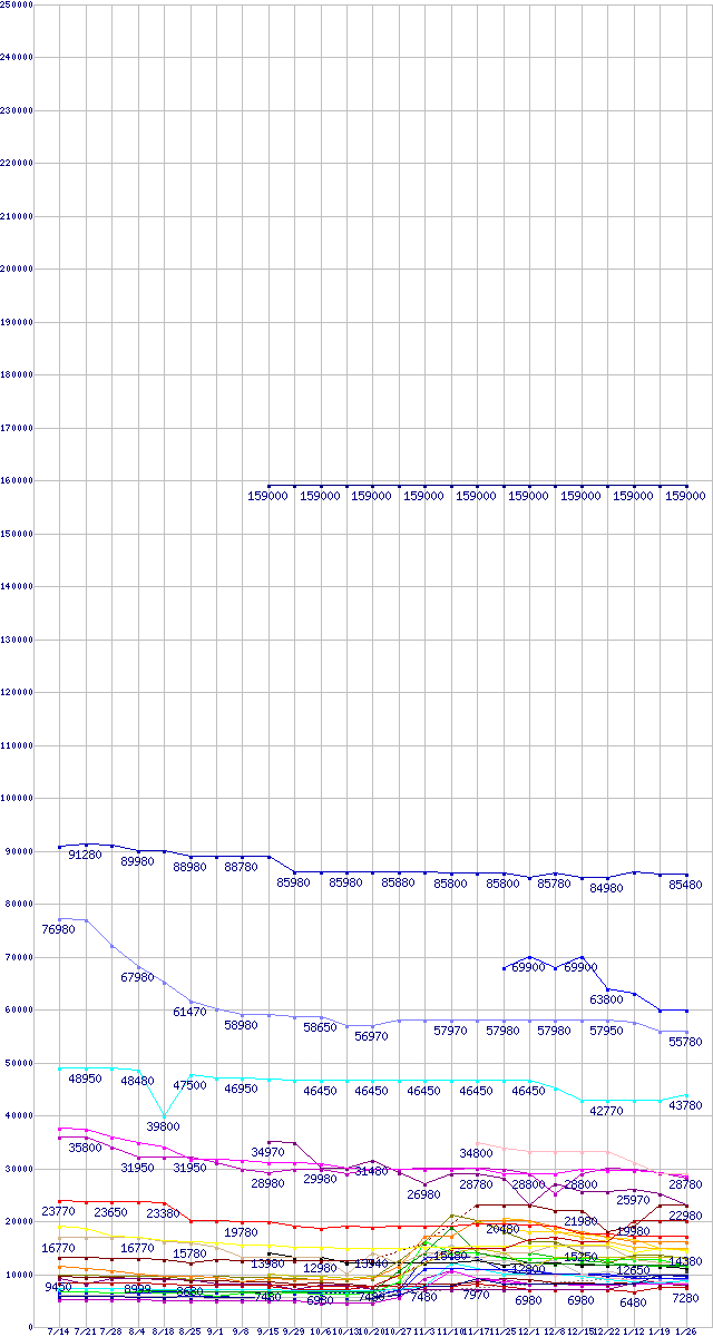 HDD/SSD主要製品の最安値推移↑前グラフ↓次グラフ(2011年7月14日〜2012年1月26日)※このグラフは過去のデータも税率5%相当に調整した税込み相当額のグラフです。凡例その他SandForce製コントローラ搭載SSD(6Gbps) (480GB,MLC)SSD 320 (600GB,MLC)MZ-7PC512 (512GB,MLC)m4 (512GB,MLC)SSDSC2MH250A2K5 (250GB,MLC)MZ-7PC256 (256GB,MLC)m4 (256GB,MLC)その他6Gbps対応SSD (256GB,MLC)その他SandForce製コントローラ搭載SSD(6Gbps) (240GB,MLC)0S03088(純正パッケージ品) (3TB,64MB)0S03191(純正パッケージ品) (2TB,64MB)SSDSC2MH120A2K5 (120GB,MLC)0S03229(純正パッケージ品) (3TB,32MB)ST3000DM001 (3TB,64MB)MZ-7PC128 (128GB,MLC)m4 (128GB,MLC)WD10JPVT (1TB,8MB)WD30EZRX (3TB,64MB)その他6Gbps対応SSD (128GB,MLC)WD25EZRX (2.5TB,64MB)ST2000DM001 (2TB,64MB)0S03224(純正パッケージ品) (2TB,32MB)その他SandForce製コントローラ搭載SSD(6Gbps) (120GB,MLC)WD10EZRX (1TB,64MB)0S03385(純正パッケージ品) (1TB,32MB)WD20EARX (2TB,64MB)0S03085 (750GB,8MB)ST2000DL003 (2TB,64MB)WD10TPVT (1TB,8MB,12.5mm厚)ST1000DM003 (1TB,64MB)HN-M101MBB (1TB,8MB)MZ-7PC064 (64GB,MLC)ST9750423AS (750GB,16MB)WD7500BPVT (750GB,8MB)その他6Gbps対応SSD (64GB,MLC)m4 (64GB,MLC)その他SandForce製コントローラ搭載SSD(6Gbps) (60GB,MLC)※製品名をクリックすると個別のグラフを表示します※点線部は販売店が確認できなかった、または調査データがないことを示します
