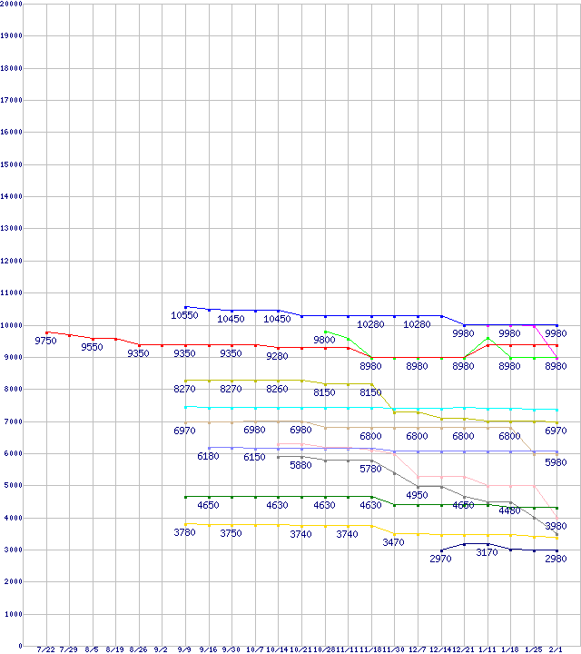CPU主要製品(最安値1万円未満)の最安値推移↑前グラフ↓次グラフ(2011年7月22日〜2012年2月1日)※このグラフは過去のデータも税率5%相当に調整した税込み相当額のグラフです。凡例Core i3-2120T (2.60GHz,TDP 35W)Core i3-2100 (3.1GHz,TDP 65W)FX-4100 (3.6GHz,L2 4MB,L3 8MB,TDP 95W)A6-3670K (2.7GHz,TDP 100W)Pentium G860 (3.0GHz,TDP 65W)A6-3500 (2.1GHz,TDP 65W)Pentium G630T (2.3GHz,TDP 35W)Athlon II X4 631 (2.6GHz,TDP 100W)Celeron G540 (2.5GHz,2MB,TDP 65W)A4-3400 (2.7GHz,TDP 65W)A4-3300 (2.5GHz,TDP 65W)Celeron G530 (2.4GHz,2MB,TDP 65W)Celeron G460 (1.8GHz,1.5MB,TDP 35W)※製品名をクリックすると個別のグラフを表示します※点線部は販売店が確認できなかった、または調査データがないことを示します
