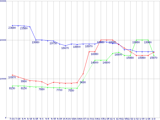 | HDD/SSD主要製品(最安値1万5千円〜2万円未満)の最安値推移 |