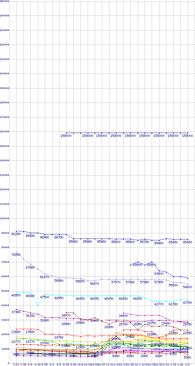 HDD/SSD主要製品の最安値推移↑前グラフ↓次グラフ(2011年7月21日〜2012年2月2日)※このグラフは過去のデータも税率5%相当に調整した税込み相当額のグラフです。凡例その他SandForce製コントローラ搭載SSD(6Gbps) (480GB,MLC)SSD 320 (600GB,MLC)MZ-7PC512 (512GB,MLC)m4 (512GB,MLC)SSDSC2MH250A2K5 (250GB,MLC)その他6Gbps対応SSD (256GB,MLC)0S03357(純正パッケージ品) (4TB,64MB)MZ-7PC256 (256GB,MLC)m4 (256GB,MLC)その他SandForce製コントローラ搭載SSD(6Gbps) (240GB,MLC)0S03088(純正パッケージ品) (3TB,64MB)SSDSC2MH120A2K5 (120GB,MLC)0S03229(純正パッケージ品) (3TB,32MB)0S03191(純正パッケージ品) (2TB,64MB)ST3000DM001 (3TB,64MB)MZ-7PC128 (128GB,MLC)m4 (128GB,MLC)WD30EZRX (3TB,64MB)WD10JPVT (1TB,8MB)0S03224(純正パッケージ品) (2TB,32MB)その他6Gbps対応SSD (128GB,MLC)その他SandForce製コントローラ搭載SSD(6Gbps) (120GB,MLC)WD25EZRX (2.5TB,64MB)ST2000DM001 (2TB,64MB)WD10TPVT (1TB,8MB,12.5mm厚)WD20EARX (2TB,64MB)WD10EZRX (1TB,64MB)0S03385(純正パッケージ品) (1TB,32MB)ST2000DL003 (2TB,64MB)HN-M101MBB (1TB,8MB)ST1000DM003 (1TB,64MB)MZ-7PC064 (64GB,MLC)ST9750423AS (750GB,16MB)WD7500BPVT (750GB,8MB)m4 (64GB,MLC)その他SandForce製コントローラ搭載SSD(6Gbps) (60GB,MLC)その他6Gbps対応SSD (64GB,MLC)※製品名をクリックすると個別のグラフを表示します※点線部は販売店が確認できなかった、または調査データがないことを示します
