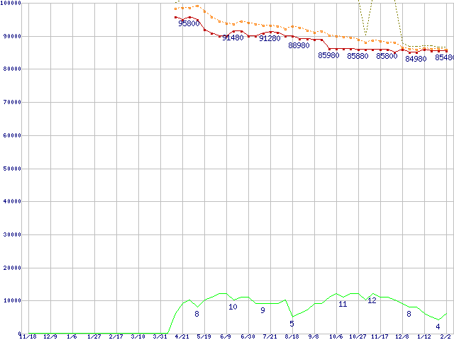 SSD 320 (600GB,MLC)の価格推移↑前グラフ↓次グラフ(2010年11月18日〜2012年2月2日)※このグラフは過去のデータも税率5%相当に調整した税込み相当額のグラフです。●関連グラフHDD/SSD主要製品の最安値推移HDD/SSD主要製品(最安値2万円以上)の最安値推移HDD 600〜750GB未満の最安値推移SSD 320 (SSD,3Gbps,2.5インチ,リード270〜200MB/s・ライト220〜45MB/s)の最安値推移●凡例最安値(点線部は販売店未確認または未調査)平均値最高値ショップ数