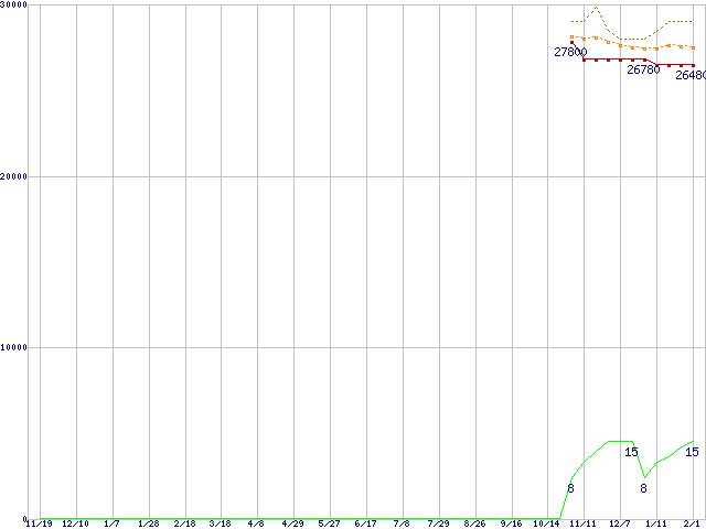 Core i7-2700K (3.50GHz)の価格推移↑前グラフ↓次グラフ(2010年11月19日〜2012年2月1日)※このグラフは過去のデータも税率5%相当に調整した税込み相当額のグラフです。●関連グラフCPU主要製品の最安値推移CPU主要製品(最安値2万円〜3万円未満)の最安値推移Intel系CPUの最安値推移LGA1155 (Smart Cache 8MB,Quad Core,GPU内蔵,Hyper-Threading,TDP 95W)の最安値推移●凡例最安値(点線部は販売店未確認または未調査)平均値最高値ショップ数
