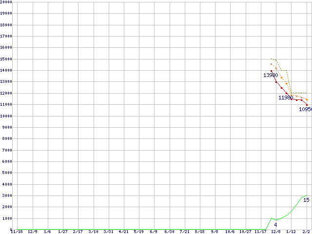 ST2000DM001 (2TB,64MB)の価格推移↑前グラフ↓次グラフ(2010年11月18日〜2012年2月2日)※このグラフは過去のデータも税率5%相当に調整した税込み相当額のグラフです。●関連グラフHDD/SSD主要製品の最安値推移HDD/SSD主要製品(最安値1万円〜1万5千円未満)の最安値推移HDD 2TB〜2.5TB未満の最安値推移Barracuda (7200rpm,6Gbps)の最安値推移●凡例最安値(点線部は販売店未確認または未調査)平均値最高値ショップ数