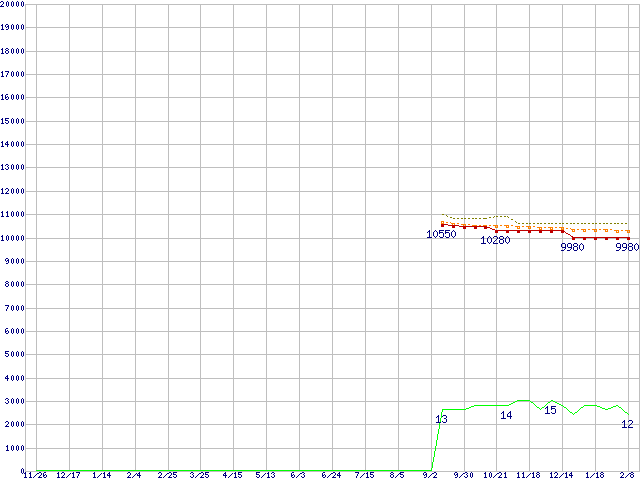 Core i3-2120T (2.60GHz,TDP 35W)の価格推移↑前グラフ↓次グラフ(2010年11月26日〜2012年2月8日)※このグラフは過去のデータも税率5%相当に調整した税込み相当額のグラフです。●関連グラフCPU主要製品の最安値推移CPU主要製品(最安値1万円未満)の最安値推移Intel系CPUの最安値推移LGA1155 (Smart Cache 3MB,Dual Core,GPU内蔵,Hyper-Threading)の最安値推移●凡例最安値(点線部は販売店未確認または未調査)平均値最高値ショップ数