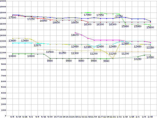 CPU主要製品(最安値1万円〜2万円未満)の最安値推移↑前グラフ↓次グラフ(2011年8月5日〜2012年2月15日)※このグラフは過去のデータも税率5%相当に調整した税込み相当額のグラフです。凡例Core i5-2500K (3.30GHz,TDP 95W)Core i5-2405S (2.50GHz,TDP 65W)FX-8120 (3.1GHz,L2 8MB,L3 8MB,TDP 125W)FX-6100 (3.3GHz,L2 6MB,L3 8MB,TDP 95W)Phenom II X4 910e (2.6GHz,L2 512KB×4,L3 6MB,TDP 65W)Phenom II X4 970 Black Edition (3.5GHz,L2 512KB×4,L3 6MB,TDP 125W)A8-3870K (3.0GHz,TDP 100W)Core i3-2125 (3.30GHz,TDP 65W)Phenom II X4 960T Black Edition (3.0GHz,L2 512KB×4,L3 6MB,TDP 95W)※製品名をクリックすると個別のグラフを表示します※点線部は販売店が確認できなかった、または調査データがないことを示します