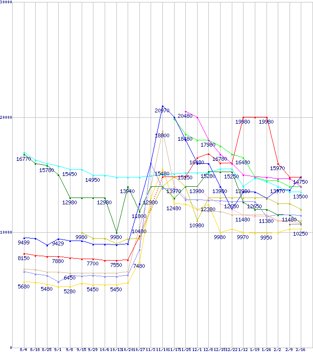 HDD/SSD主要製品(最安値1万円〜1万5千円未満)の最安値推移↑前グラフ↓次グラフ(2011年8月4日〜2012年2月16日)※このグラフは過去のデータも税率5%相当に調整した税込み相当額のグラフです。凡例WD30EZRX (3TB,64MB)0S03191(純正パッケージ品) (2TB,64MB)MZ-7PC128 (128GB,MLC)ST3000DM001 (3TB,64MB)m4 (128GB,MLC)WD10JPVT (1TB,8MB)0S03224(純正パッケージ品) (2TB,32MB)WD25EZRX (2.5TB,64MB)その他6Gbps対応SSD (120〜128GB,MLC)ST2000DM001 (2TB,64MB)SSD 520 (60GB,MLC)WD20EARX (2TB,64MB)※製品名をクリックすると個別のグラフを表示します※点線部は販売店が確認できなかった、または調査データがないことを示します