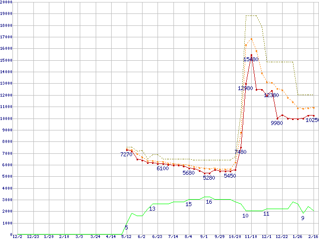 WD20EARX (2TB,64MB)の価格推移↑前グラフ↓次グラフ(2010年12月2日〜2012年2月16日)※このグラフは過去のデータも税率5%相当に調整した税込み相当額のグラフです。●関連グラフHDD/SSD主要製品の最安値推移HDD/SSD主要製品(最安値1万円〜1万5千円未満)の最安値推移HDD 2TB〜2.5TB未満の最安値推移WD Caviar Green (6Gb/s)の最安値推移●凡例最安値(点線部は販売店未確認または未調査)平均値最高値ショップ数
