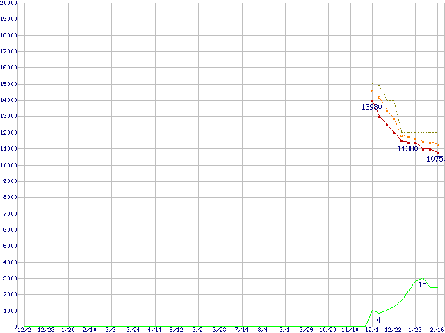 ST2000DM001 (2TB,64MB)の価格推移↑前グラフ↓次グラフ(2010年12月2日〜2012年2月16日)※このグラフは過去のデータも税率5%相当に調整した税込み相当額のグラフです。●関連グラフHDD/SSD主要製品の最安値推移HDD/SSD主要製品(最安値1万円〜1万5千円未満)の最安値推移HDD 2TB〜2.5TB未満の最安値推移Barracuda (7200rpm,6Gbps)の最安値推移●凡例最安値(点線部は販売店未確認または未調査)平均値最高値ショップ数