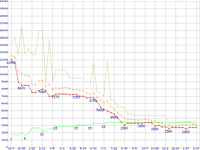 PC3-12800 4GB×2枚組みセットの価格推移↑前グラフ↓次グラフ(2010年12月4日〜2012年2月17日)※このグラフは過去のデータも税率5%相当に調整した税込み相当額のグラフです。●関連グラフメモリ主要製品の最安値推移メモリ主要製品(最安値5千円未満)の最安値推移PC3-12800(DDR3-1600) DDR3 SDRAM DIMMの最安値推移●凡例最安値(点線部は販売店未確認または未調査)平均値最高値ショップ数