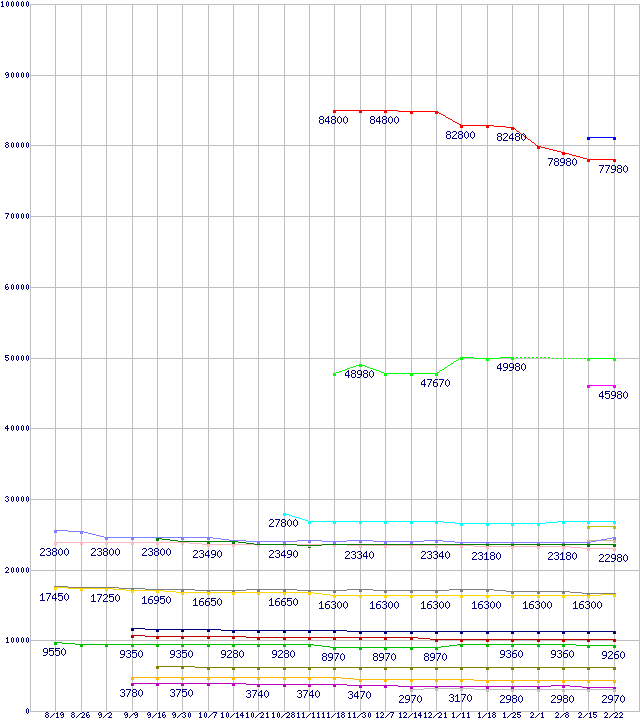 Intel系CPUの最安値推移↑前グラフ↓次グラフ(2011年8月19日〜2012年2月22日)※このグラフは過去のデータも税率5%相当に調整した税込み相当額のグラフです。凡例Core i7-3960X Extreme Edition(バルク品/セット販売のみ) (3.30GHz,15MB)Core i7-3960X Extreme Edition (3.30GHz,15MB)Core i7-3930K (3.20GHz,12MB)Core i7-3930K(バルク品/セット販売のみ) (3.20GHz,12MB)Core i7-2700K (3.50GHz)Core i7-3820 (3.60GHz,10MB)Core i7-2600K (3.40GHz)Core i7-3820(バルク品/セット販売のみ) (3.60GHz,10MB)Core i7-2600S (2.80GHz)Core i7-2600 (3.40GHz)Core i5-2500K (3.30GHz,TDP 95W)Core i5-2405S (2.50GHz,TDP 65W)Core i3-2125 (3.30GHz,TDP 65W)Core i3-2120T (2.60GHz,TDP 35W)Core i3-2100 (3.1GHz,TDP 65W)Pentium G630T (2.3GHz,TDP 35W)Celeron G540 (2.5GHz,2MB,TDP 65W)Celeron G530 (2.4GHz,2MB,TDP 65W)Celeron G460 (1.8GHz,1.5MB,TDP 35W)※製品名をクリックすると個別のグラフを表示します※点線部は販売店が確認できなかった、または調査データがないことを示します
