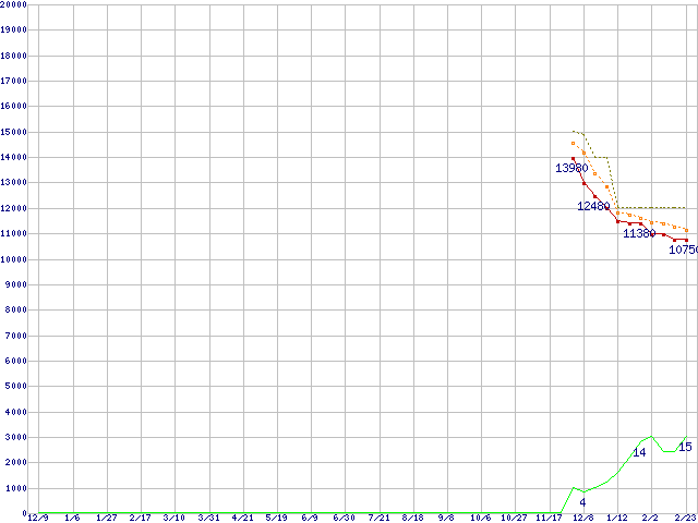 ST2000DM001 (2TB,64MB)の価格推移↑前グラフ↓次グラフ(2010年12月9日〜2012年2月23日)※このグラフは過去のデータも税率5%相当に調整した税込み相当額のグラフです。●関連グラフHDD/SSD主要製品の最安値推移HDD/SSD主要製品(最安値1万円〜1万5千円未満)の最安値推移HDD 2TB〜2.5TB未満の最安値推移Barracuda (7200rpm,6Gbps)の最安値推移●凡例最安値(点線部は販売店未確認または未調査)平均値最高値ショップ数