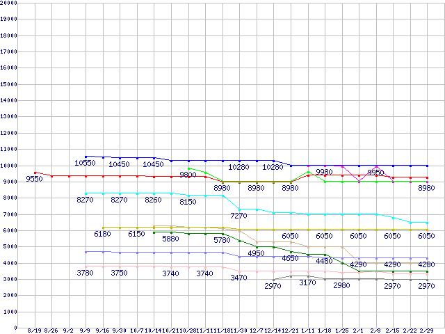 CPU主要製品(最安値1万円未満)の最安値推移↑前グラフ↓次グラフ(2011年8月19日〜2012年2月29日)※このグラフは過去のデータも税率5%相当に調整した税込み相当額のグラフです。凡例Core i3-2120T (2.60GHz,TDP 35W)Core i3-2100 (3.1GHz,TDP 65W)FX-4100 (3.6GHz,L2 4MB,L3 8MB,TDP 95W)A6-3670K (2.7GHz,TDP 100W)A6-3500 (2.1GHz,TDP 65W)Pentium G630T (2.3GHz,TDP 35W)Celeron G540 (2.5GHz,2MB,TDP 65W)A4-3400 (2.7GHz,TDP 65W)A4-3300 (2.5GHz,TDP 65W)Celeron G530 (2.4GHz,2MB,TDP 65W)Celeron G460 (1.8GHz,1.5MB,TDP 35W)※製品名をクリックすると個別のグラフを表示します※点線部は販売店が確認できなかった、または調査データがないことを示します