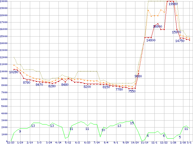 0S03191(純正パッケージ品) (2TB,64MB)の価格推移↑前グラフ↓次グラフ(2010年12月23日〜2012年3月1日)※このグラフは過去のデータも税率5%相当に調整した税込み相当額のグラフです。●関連グラフHDD/SSD主要製品の最安値推移HDD/SSD主要製品(最安値1万円〜1万5千円未満)の最安値推移HDD 2TB〜2.5TB未満の最安値推移DESKSTAR (6Gb/s)の最安値推移●凡例最安値(点線部は販売店未確認または未調査)平均値最高値ショップ数