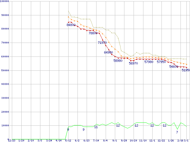 m4 (512GB,MLC)の価格推移↑前グラフ↓次グラフ(2010年12月23日〜2012年3月1日)※このグラフは過去のデータも税率5%相当に調整した税込み相当額のグラフです。●関連グラフHDD/SSD主要製品の最安値推移HDD/SSD主要製品(最安値2万円以上)の最安値推移HDD 500〜600GB未満の最安値推移m4 (SSD,6Gbps,2.5インチ,リード415MB/s・ライト260〜95MB/s)の最安値推移●凡例最安値(点線部は販売店未確認または未調査)平均値最高値ショップ数