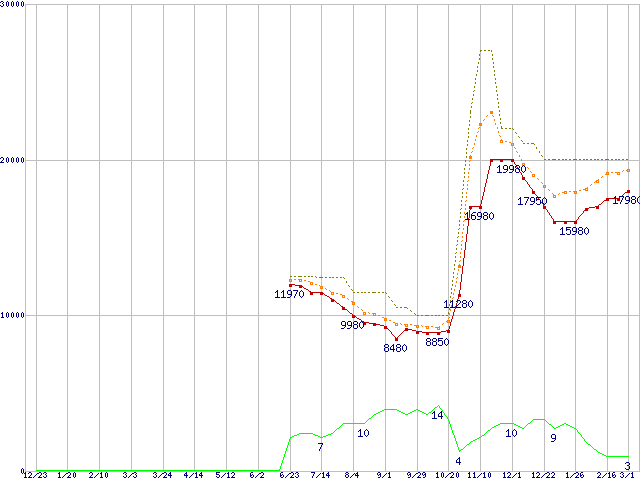 0S03229(純正パッケージ品) (3TB,32MB)の価格推移↑前グラフ↓次グラフ(2010年12月23日〜2012年3月1日)※このグラフは過去のデータも税率5%相当に調整した税込み相当額のグラフです。●関連グラフHDD/SSD主要製品の最安値推移HDD/SSD主要製品(最安値1万5千円〜2万円未満)の最安値推移HDD 3TB〜4TB未満の最安値推移DESKSTAR (6Gb/s)の最安値推移●凡例最安値(点線部は販売店未確認または未調査)平均値最高値ショップ数