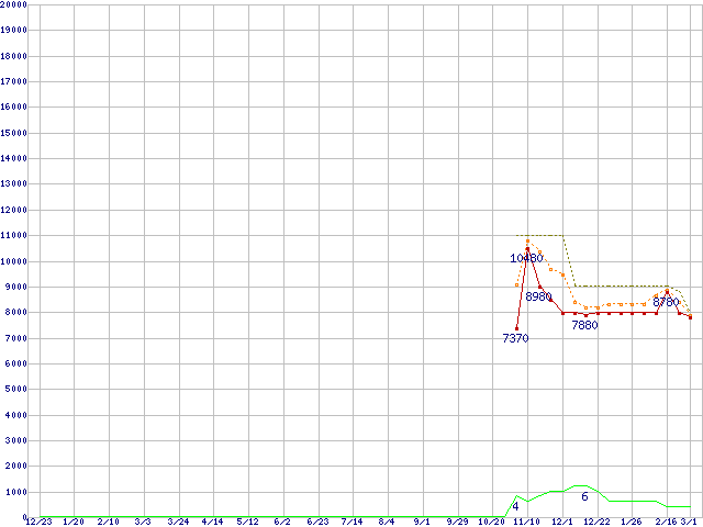 ST9750423AS (750GB,16MB)の価格推移↑前グラフ↓次グラフ(2010年12月23日〜2012年3月1日)※このグラフは過去のデータも税率5%相当に調整した税込み相当額のグラフです。●関連グラフHDD/SSD主要製品の最安値推移HDD/SSD主要製品(最安値1万円未満)の最安値推移HDD 750GB〜1TB未満の最安値推移Momentus (5400rpm,SATA 3Gb/s,2.5インチ)の最安値推移●凡例最安値(点線部は販売店未確認または未調査)平均値最高値ショップ数