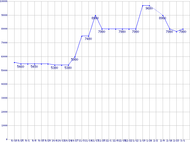 | TRAVELSTAR (5400rpm,3Gb/s,2.5インチ)の最安値推移 |