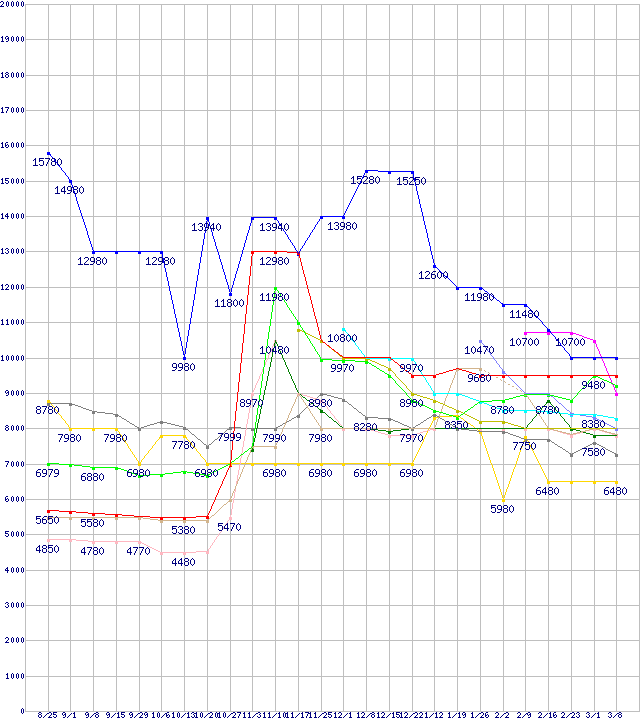 HDD/SSD主要製品(最安値1万円未満)の最安値推移↑前グラフ↓次グラフ(2011年8月25日〜2012年3月8日)※このグラフは過去のデータも税率5%相当に調整した税込み相当額のグラフです。凡例その他6Gbps対応SSD (120〜128GB,MLC)ST2000DL003 (2TB,64MB)HN-M101MBB (1TB,8MB)SSD 520 (60GB,MLC)ST1000DM003 (1TB,64MB)MZ-7PC064 (64GB,MLC)WD10EZRX (1TB,64MB)0S03085 (750GB,8MB)ST9750423AS (750GB,16MB)WD7500BPVT (750GB,8MB)m4 (64GB,MLC)その他6Gbps対応SSD (60〜64GB,MLC)※製品名をクリックすると個別のグラフを表示します※点線部は販売店が確認できなかった、または調査データがないことを示します