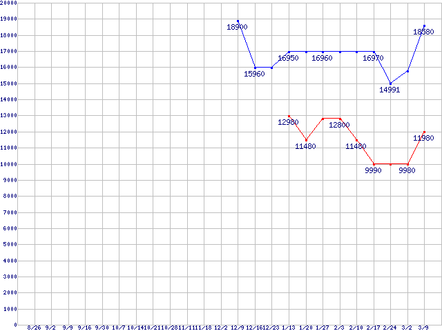 | ※製品名をクリックすると個別のグラフを表示します ※点線部は販売店が確認できなかった、または調査データがないことを示します |
