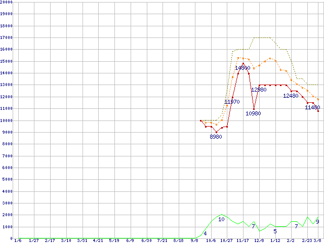 WD10JPVT (1TB,8MB)の価格推移↑前グラフ↓次グラフ(2011年1月6日〜2012年3月8日)※このグラフは過去のデータも税率5%相当に調整した税込み相当額のグラフです。●関連グラフHDD/SSD主要製品の最安値推移HDD/SSD主要製品(最安値1万円〜1万5千円未満)の最安値推移HDD 1TB〜1.5TB未満の最安値推移WD Scorpio Blue (5200〜5400rpm,3Gb/s,2.5インチ)の最安値推移●凡例最安値(点線部は販売店未確認または未調査)平均値最高値ショップ数