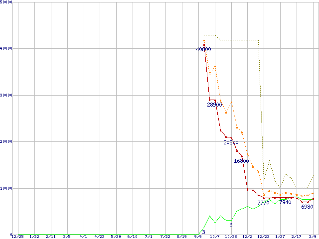 PC3-10600 8GB×2枚組セットの価格推移↑前グラフ↓次グラフ(2010年12月25日〜2012年3月9日)※このグラフは過去のデータも税率5%相当に調整した税込み相当額のグラフです。●関連グラフメモリ主要製品の最安値推移メモリ主要製品(最安値5千円〜1万円未満)の最安値推移PC3-10600(DDR3-1333) DDR3 SDRAM DIMMの最安値推移●凡例最安値(点線部は販売店未確認または未調査)平均値最高値ショップ数