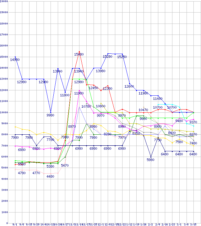 HDD/SSD主要製品(最安値1万円未満)の最安値推移↑前グラフ↓次グラフ(2011年9月1日〜2012年3月15日)※このグラフは過去のデータも税率5%相当に調整した税込み相当額のグラフです。凡例その他6Gbps対応SSD (120〜128GB,MLC)WD20EARX (2TB,64MB)ST2000DL003 (2TB,64MB)HN-M101MBB (1TB,8MB)SSD 520 (60GB,MLC)ST1000DM003 (1TB,64MB)ST9750423AS (750GB,16MB)WD10EZRX (1TB,64MB)0S03085 (750GB,8MB)WD7500BPVT (750GB,8MB)MZ-7PC064 (64GB,MLC)m4 (64GB,MLC)その他6Gbps対応SSD (60〜64GB,MLC)※製品名をクリックすると個別のグラフを表示します※点線部は販売店が確認できなかった、または調査データがないことを示します