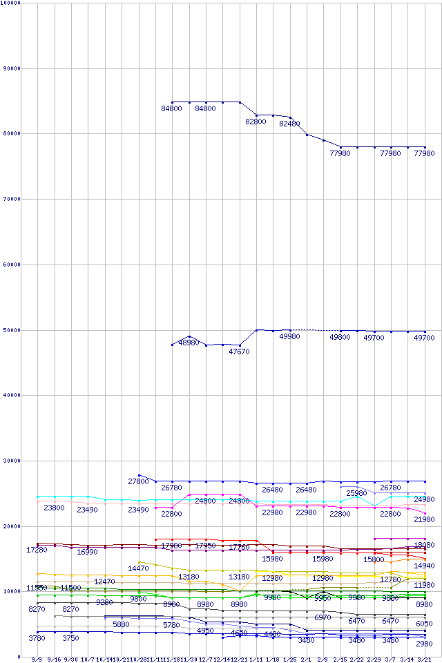 CPU主要製品の最安値推移↑前グラフ(2011年9月9日〜2012年3月21日)※このグラフは過去のデータも税率5%相当に調整した税込み相当額のグラフです。凡例Core i7-3960X Extreme Edition (3.30GHz,15MB)Core i7-3930K (3.20GHz,12MB)Core i7-2700K (3.50GHz)Core i7-3820 (3.60GHz,10MB)Core i7-2600K (3.40GHz)Core i7-2600 (3.40GHz)FX-8150 (3.6GHz,L2 8MB,L3 8MB,TDP 125W)Core i5-2550K (3.40GHz,TDP 95W)Core i5-2405S (2.50GHz,TDP 65W)Core i5-2500K (3.30GHz,TDP 95W)Core i5-2450P (3.20GHz,TDP 95W)FX-8120 (3.1GHz,L2 8MB,L3 8MB,TDP 125W)Core i5-2380P (3.10GHz,TDP 95W)Phenom II X4 970 Black Edition (3.5GHz,L2 512KB×4,L3 6MB,TDP 125W)A8-3820 (2.5GHz,TDP 65W)A8-3870K (3.0GHz,TDP 100W)FX-6100 (3.3GHz,L2 6MB,L3 8MB,TDP 95W)Phenom II X4 960T Black Edition (3.0GHz,L2 512KB×4,L3 6MB,TDP 95W)Core i3-2125 (3.30GHz,TDP 65W)Core i3-2120T (2.60GHz,TDP 35W)Core i3-2100 (3.1GHz,TDP 65W)FX-4100 (3.6GHz,L2 4MB,L3 8MB,TDP 95W)A6-3670K (2.7GHz,TDP 100W)A6-3500 (2.1GHz,TDP 65W)Pentium G630T (2.3GHz,TDP 35W)Celeron G540 (2.5GHz,2MB,TDP 65W)A4-3400 (2.7GHz,TDP 65W)Celeron G530 (2.4GHz,2MB,TDP 65W)Celeron G460 (1.8GHz,1.5MB,TDP 35W)A4-3300 (2.5GHz,TDP 65W)※製品名をクリックすると個別のグラフを表示します※点線部は販売店が確認できなかった、または調査データがないことを示します