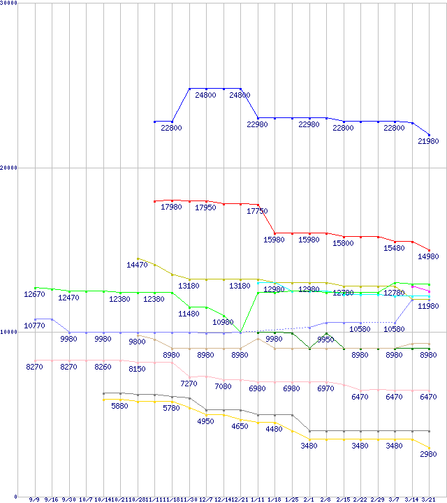 AMD系CPUの最安値推移↑前グラフ↓次グラフ(2011年9月9日〜2012年3月21日)※このグラフは過去のデータも税率5%相当に調整した税込み相当額のグラフです。凡例FX-8150 (3.6GHz,L2 8MB,L3 8MB,TDP 125W)FX-8120 (3.1GHz,L2 8MB,L3 8MB,TDP 125W)Phenom II X4 970 Black Edition (3.5GHz,L2 512KB×4,L3 6MB,TDP 125W)A8-3820 (2.5GHz,TDP 65W)A8-3870K (3.0GHz,TDP 100W)FX-6100 (3.3GHz,L2 6MB,L3 8MB,TDP 95W)Phenom II X4 960T Black Edition (3.0GHz,L2 512KB×4,L3 6MB,TDP 95W)FX-4100 (3.6GHz,L2 4MB,L3 8MB,TDP 95W)A6-3670K (2.7GHz,TDP 100W)A6-3500 (2.1GHz,TDP 65W)A4-3400 (2.7GHz,TDP 65W)A4-3300 (2.5GHz,TDP 65W)※製品名をクリックすると個別のグラフを表示します※点線部は販売店が確認できなかった、または調査データがないことを示します