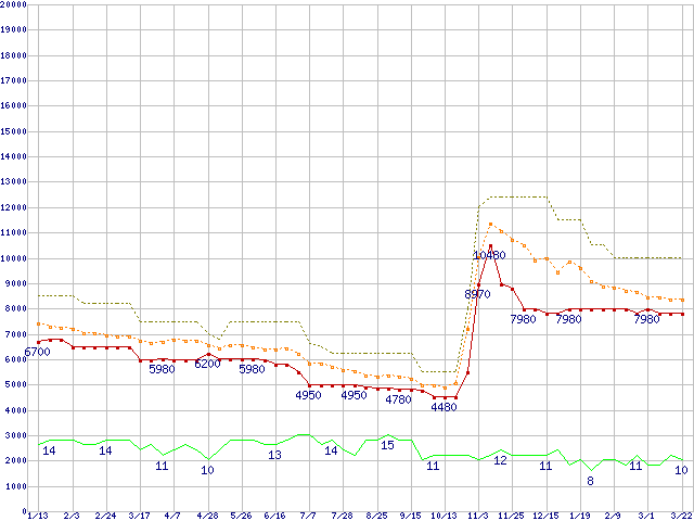 WD7500BPVT (750GB,8MB)の価格推移↑前グラフ↓次グラフ(2011年1月13日〜2012年3月22日)※このグラフは過去のデータも税率5%相当に調整した税込み相当額のグラフです。●関連グラフHDD/SSD主要製品の最安値推移HDD/SSD主要製品(最安値1万円未満)の最安値推移HDD 750GB〜1TB未満の最安値推移WD Scorpio Blue (5200〜5400rpm,3Gb/s,2.5インチ)の最安値推移●凡例最安値(点線部は販売店未確認または未調査)平均値最高値ショップ数