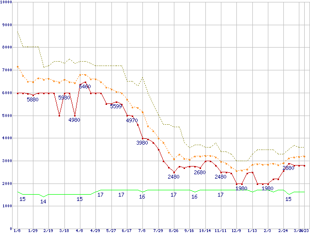 PC3-10600 4GB×2枚組みセットの価格推移↑前グラフ↓次グラフ(2011年1月8日〜2012年3月23日)※このグラフは過去のデータも税率5%相当に調整した税込み相当額のグラフです。●関連グラフメモリ主要製品の最安値推移メモリ主要製品(最安値5千円未満)の最安値推移PC3-10600(DDR3-1333) DDR3 SDRAM DIMMの最安値推移●凡例最安値(点線部は販売店未確認または未調査)平均値最高値ショップ数