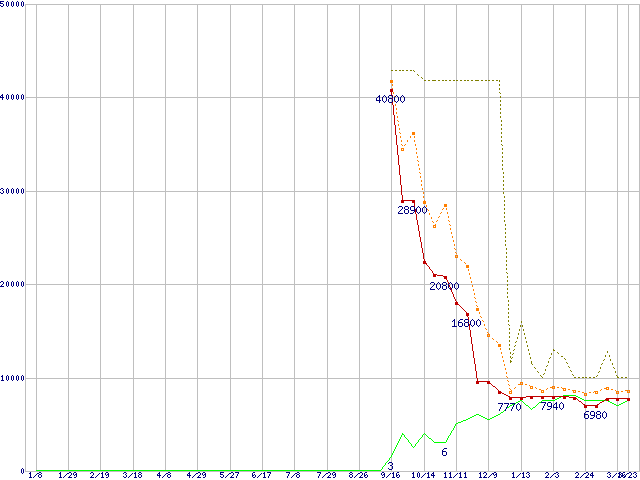 PC3-10600 8GB×2枚組セットの価格推移↑前グラフ↓次グラフ(2011年1月8日〜2012年3月23日)※このグラフは過去のデータも税率5%相当に調整した税込み相当額のグラフです。●関連グラフメモリ主要製品の最安値推移メモリ主要製品(最安値5千円〜1万円未満)の最安値推移PC3-10600(DDR3-1333) DDR3 SDRAM DIMMの最安値推移●凡例最安値(点線部は販売店未確認または未調査)平均値最高値ショップ数