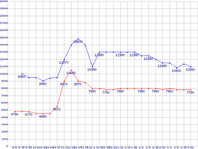 | WD Scorpio Blue (5200〜5400rpm,3Gb/s,2.5インチ)の最安値推移 |