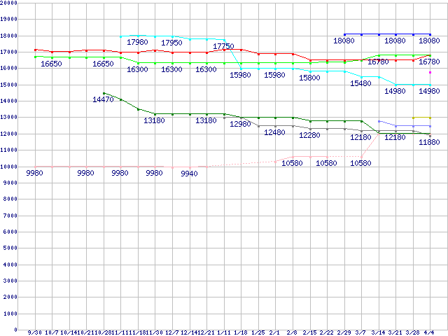 CPU主要製品(最安値1万円〜2万円未満)の最安値推移↑前グラフ↓次グラフ(2011年9月30日〜2012年4月4日)※このグラフは過去のデータも税率5%相当に調整した税込み相当額のグラフです。凡例Core i5-2550K (3.40GHz,TDP 95W)Core i5-2500K (3.30GHz,TDP 95W)Core i5-2405S (2.50GHz,TDP 65W)FX-6200 (3.8GHz,L2 6MB,L3 8MB,TDP 125W)FX-8120 (3.1GHz,L2 8MB,L3 8MB,TDP 125W)FX-4170 (4.2GHz,L2 4MB,L3 8MB,TDP 125W)A8-3820 (2.5GHz,TDP 65W)Phenom II X4 965 Black Edition (3.4GHz,L2 512KB×4,L3 6MB,TDP 140W)FX-6100 (3.3GHz,L2 6MB,L3 8MB,TDP 95W)Phenom II X4 960T Black Edition (3.0GHz,L2 512KB×4,L3 6MB,TDP 95W)A8-3870K (3.0GHz,TDP 100W)※製品名をクリックすると個別のグラフを表示します※点線部は販売店が確認できなかった、または調査データがないことを示します
