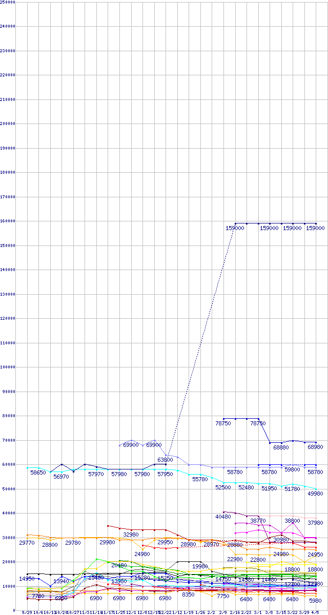 HDD/SSD主要製品の最安値推移↑前グラフ↓次グラフ(2011年9月29日〜2012年4月5日)※このグラフは過去のデータも税率5%相当に調整した税込み相当額のグラフです。凡例その他6Gbps対応SSD (480〜512GB,MLC)SSD 520 (480GB,MLC)PX-512M3P (512GB,MLC)MZ-7PC512 (512GB,MLC)m4 (512GB,MLC)PX-256M3P (256GB,MLC)PX-256M3 (256GB,MLC)PX-256M2P (256GB,MLC)SSD 520 (240GB,MLC)0S03357(純正パッケージ品) (4TB,64MB)MZ-7PC256 (256GB,MLC)0S03361(純正パッケージ品) (4TB,32MB)m4 (256GB,MLC)その他6Gbps対応SSD (240〜256GB,MLC)0S03229(純正パッケージ品) (3TB,32MB)PX-128M3P (128GB,MLC)PX-128M3 (128GB,MLC)SSD 520 (120GB,MLC)PX-128M2P (128GB,MLC)ST3000DM001 (3TB,64MB)MZ-7PC128 (128GB,MLC)WD30EZRX (3TB,64MB)m4 (128GB,MLC)0S03191(純正パッケージ品) (2TB,64MB)0S03224(純正パッケージ品) (2TB,32MB)WD10JPVT (1TB,8MB)0S03509 (1TB,8MB)ST2000DM001 (2TB,64MB)その他6Gbps対応SSD (120〜128GB,MLC)ST2000DL003 (2TB,64MB)WD20EARX (2TB,64MB)HN-M101MBB (1TB,8MB)SSD 520 (60GB,MLC)0S03085 (750GB,8MB)ST1000DM003 (1TB,64MB)WD7500BPVT (750GB,8MB)WD10EZRX (1TB,64MB)MZ-7PC064 (64GB,MLC)m4 (64GB,MLC)その他6Gbps対応SSD (60〜64GB,MLC)※製品名をクリックすると個別のグラフを表示します※点線部は販売店が確認できなかった、または調査データがないことを示します