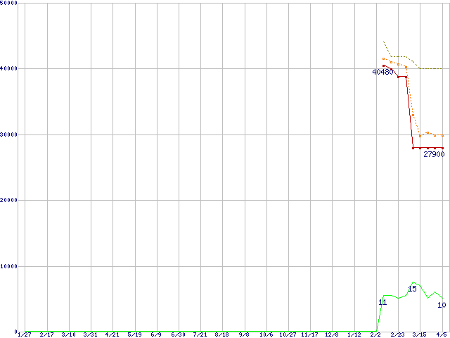 SSD 520 (240GB,MLC)の価格推移↑前グラフ↓次グラフ(2011年1月27日〜2012年4月5日)※このグラフは過去のデータも税率5%相当に調整した税込み相当額のグラフです。●関連グラフHDD/SSD主要製品の最安値推移HDD/SSD主要製品(最安値2万円以上)の最安値推移HDD 200〜250GB未満の最安値推移SSD 520 (SSD,6Gbps,2.5インチ,リード550MB/s・ライト520〜475MB/s)の最安値推移●凡例最安値(点線部は販売店未確認または未調査)平均値最高値ショップ数