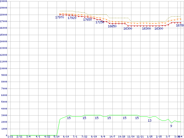 Core i5-2405S (2.50GHz,TDP 65W)の価格推移↑前グラフ↓次グラフ(2011年1月21日〜2012年4月4日)※このグラフは過去のデータも税率5%相当に調整した税込み相当額のグラフです。●関連グラフCPU主要製品の最安値推移CPU主要製品(最安値1万円〜2万円未満)の最安値推移Intel系CPUの最安値推移LGA1155 (Smart Cache 6MB,Quad Core,GPU内蔵)の最安値推移●凡例最安値(点線部は販売店未確認または未調査)平均値最高値ショップ数