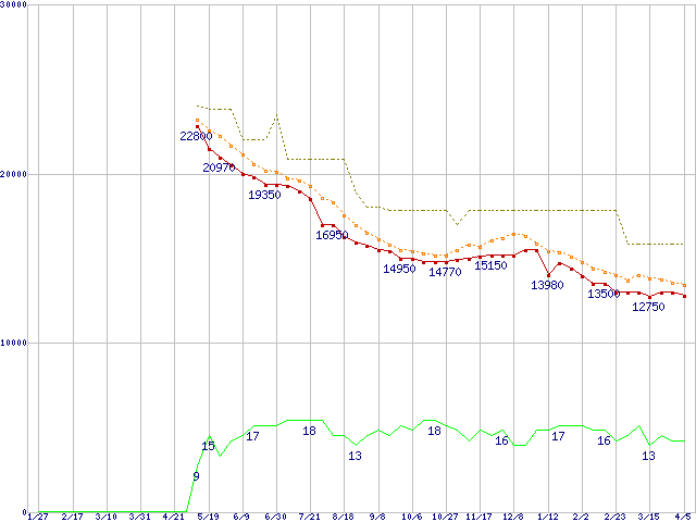 m4 (128GB,MLC)の価格推移↑前グラフ↓次グラフ(2011年1月27日〜2012年4月5日)※このグラフは過去のデータも税率5%相当に調整した税込み相当額のグラフです。●関連グラフHDD/SSD主要製品の最安値推移HDD/SSD主要製品(最安値1万円〜1万5千円未満)の最安値推移HDD 100〜160GB未満の最安値推移m4 (SSD,6Gbps,2.5インチ,リード415MB/s・ライト260〜95MB/s)の最安値推移●凡例最安値(点線部は販売店未確認または未調査)平均値最高値ショップ数