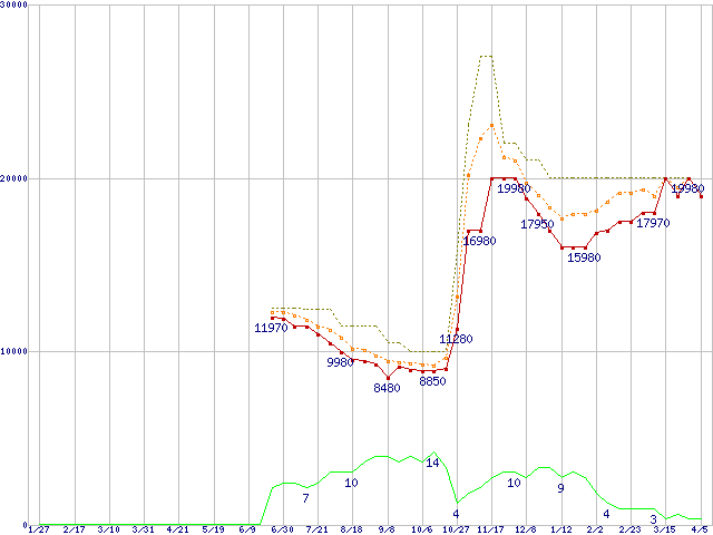 0S03229(純正パッケージ品) (3TB,32MB)の価格推移↑前グラフ↓次グラフ(2011年1月27日〜2012年4月5日)※このグラフは過去のデータも税率5%相当に調整した税込み相当額のグラフです。●関連グラフHDD/SSD主要製品の最安値推移HDD/SSD主要製品(最安値1万5千円〜2万円未満)の最安値推移HDD 3TB〜4TB未満の最安値推移DESKSTAR (6Gb/s)の最安値推移●凡例最安値(点線部は販売店未確認または未調査)平均値最高値ショップ数