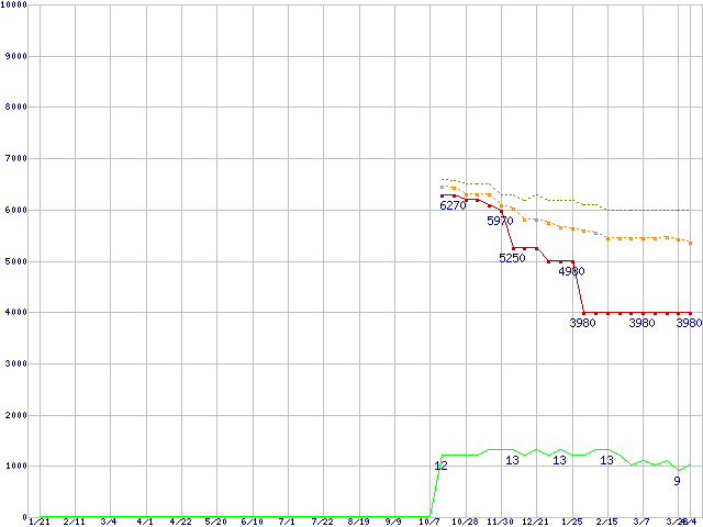 A4-3400 (2.7GHz,TDP 65W)の価格推移↑前グラフ↓次グラフ(2011年1月21日〜2012年4月4日)※このグラフは過去のデータも税率5%相当に調整した税込み相当額のグラフです。●関連グラフCPU主要製品の最安値推移CPU主要製品(最安値1万円未満)の最安値推移AMD系CPUの最安値推移Socket FM1 (Cache 1MB,2Core,Radeon HD 6410D)の最安値推移●凡例最安値(点線部は販売店未確認または未調査)平均値最高値ショップ数