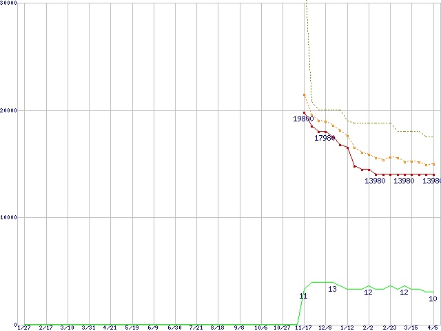 MZ-7PC128 (128GB,MLC)の価格推移↑前グラフ↓次グラフ(2011年1月27日〜2012年4月5日)※このグラフは過去のデータも税率5%相当に調整した税込み相当額のグラフです。●関連グラフHDD/SSD主要製品の最安値推移HDD/SSD主要製品(最安値1万円〜1万5千円未満)の最安値推移HDD 100〜160GB未満の最安値推移SSD 830 (SSD,6Gb/s,2.5インチ,リード520MB/s・ライト400〜160MB/s,7mm厚)の最安値推移●凡例最安値(点線部は販売店未確認または未調査)平均値最高値ショップ数