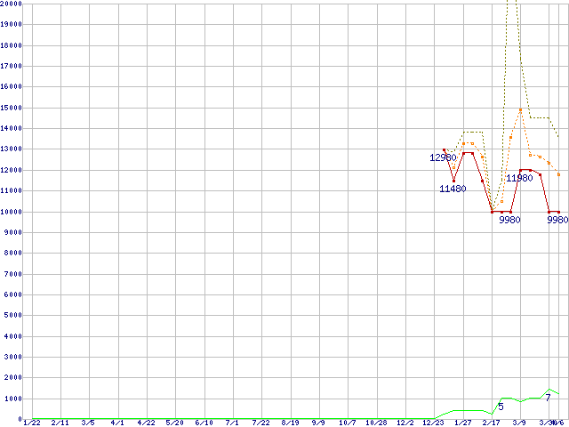 PC3-12800 8GB×2枚組セットの価格推移↑前グラフ↓次グラフ(2011年1月22日〜2012年4月6日)※このグラフは過去のデータも税率5%相当に調整した税込み相当額のグラフです。●関連グラフメモリ主要製品の最安値推移メモリ主要製品(最安値5千円〜1万円未満)の最安値推移PC3-12800(DDR3-1600) DDR3 SDRAM DIMMの最安値推移●凡例最安値(点線部は販売店未確認または未調査)平均値最高値ショップ数