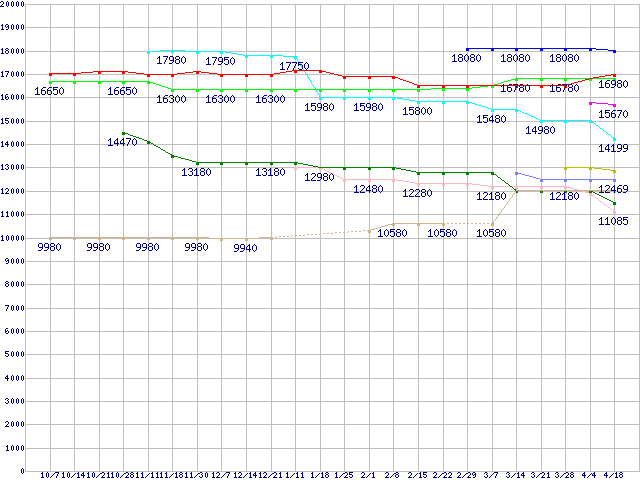 CPU主要製品(最安値1万円〜2万円未満)の最安値推移↑前グラフ↓次グラフ(2011年10月7日〜2012年4月18日)※このグラフは過去のデータも税率5%相当に調整した税込み相当額のグラフです。凡例Core i5-2550K (3.40GHz,TDP 95W)Core i5-2500K (3.30GHz,TDP 95W)Core i5-2405S (2.50GHz,TDP 65W)FX-6200 (3.8GHz,L2 6MB,L3 8MB,TDP 125W)FX-8120 (3.1GHz,L2 8MB,L3 8MB,TDP 125W)FX-4170 (4.2GHz,L2 4MB,L3 8MB,TDP 125W)A8-3820 (2.5GHz,TDP 65W)Phenom II X4 960T Black Edition (3.0GHz,L2 512KB×4,L3 6MB,TDP 95W)FX-6100 (3.3GHz,L2 6MB,L3 8MB,TDP 95W)A8-3870K (3.0GHz,TDP 100W)※製品名をクリックすると個別のグラフを表示します※点線部は販売店が確認できなかった、または調査データがないことを示します
