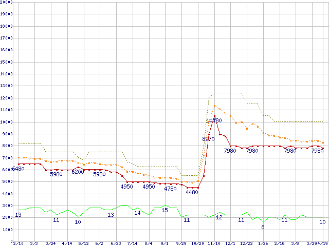 WD7500BPVT (750GB,8MB)の価格推移↑前グラフ↓次グラフ(2011年2月10日〜2012年4月19日)※このグラフは過去のデータも税率5%相当に調整した税込み相当額のグラフです。●関連グラフHDD/SSD主要製品の最安値推移HDD/SSD主要製品(最安値1万円未満)の最安値推移HDD 750GB〜1TB未満の最安値推移WD Scorpio Blue (5200〜5400rpm,3Gb/s,2.5インチ)の最安値推移●凡例最安値(点線部は販売店未確認または未調査)平均値最高値ショップ数