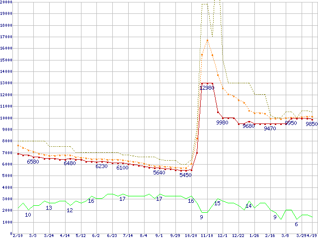 ST2000DL003 (2TB,64MB)の価格推移↑前グラフ↓次グラフ(2011年2月10日〜2012年4月19日)※このグラフは過去のデータも税率5%相当に調整した税込み相当額のグラフです。●関連グラフHDD/SSD主要製品の最安値推移HDD/SSD主要製品(最安値1万円未満)の最安値推移HDD 2TB〜2.5TB未満の最安値推移Barracuda Green (5900rpm,6Gbps)の最安値推移●凡例最安値(点線部は販売店未確認または未調査)平均値最高値ショップ数
