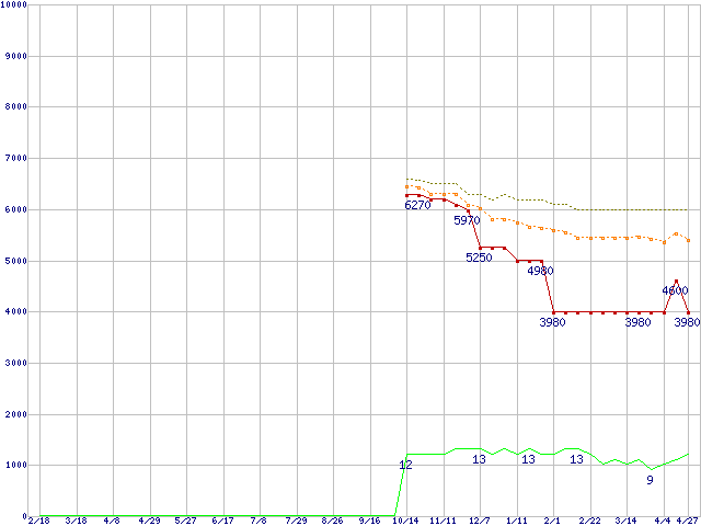A4-3400 (2.7GHz,TDP 65W)の価格推移↑前グラフ↓次グラフ(2011年2月18日〜2012年4月27日)※このグラフは過去のデータも税率5%相当に調整した税込み相当額のグラフです。●関連グラフCPU主要製品の最安値推移CPU主要製品(最安値1万円未満)の最安値推移AMD系CPUの最安値推移Socket FM1 (Cache 1MB,2Core,Radeon HD 6410D)の最安値推移●凡例最安値(点線部は販売店未確認または未調査)平均値最高値ショップ数