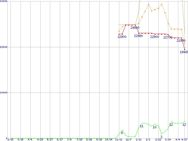 FX-8150 (3.6GHz,L2 8MB,L3 8MB,TDP 125W)の価格推移↑前グラフ↓次グラフ(2011年2月18日〜2012年4月27日)※このグラフは過去のデータも税率5%相当に調整した税込み相当額のグラフです。●関連グラフCPU主要製品の最安値推移CPU主要製品(最安値1万円〜2万円未満)の最安値推移AMD系CPUの最安値推移Socket AM3+ (HyperTransport,8Core)の最安値推移AMD製CPU上位モデルの価格推移●凡例最安値(点線部は販売店未確認または未調査)平均値最高値ショップ数