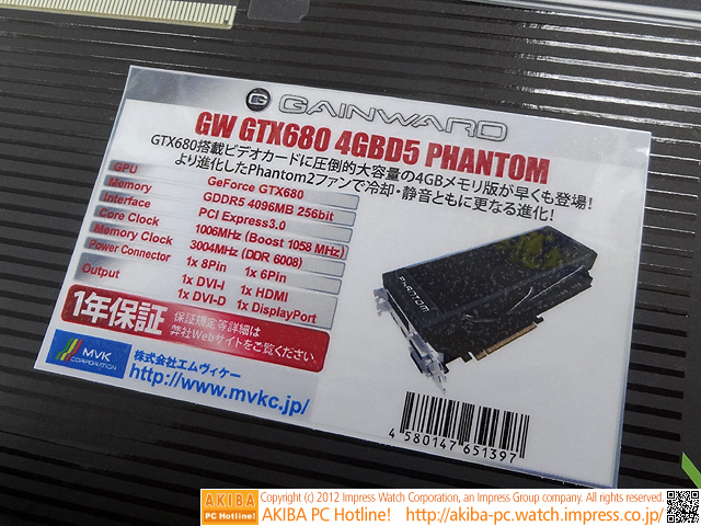 ![]() | AKIBA PC Hotline! [拡大画像]4GBメモリのGTX 680が登場、実売約6万円から 今週見つけた新製品:ビデオカード GAINWARD GW GTX680 4GBD5 PHANTOM(NE5X680010G2-1041P) |